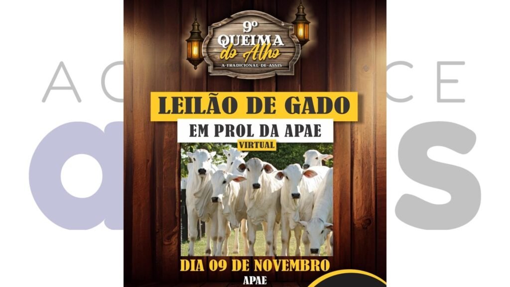 ASSIS – A 9ª Queima do Alho, que acontece neste domingo, 9 de novembro, incluirá um leilão virtual de gado em benefício da Associação de Pais e Amigos dos Excepcionais (APAE) de Assis. Toda a renda arrecadada com os lances será destinada aos projetos desenvolvidos pela instituição.