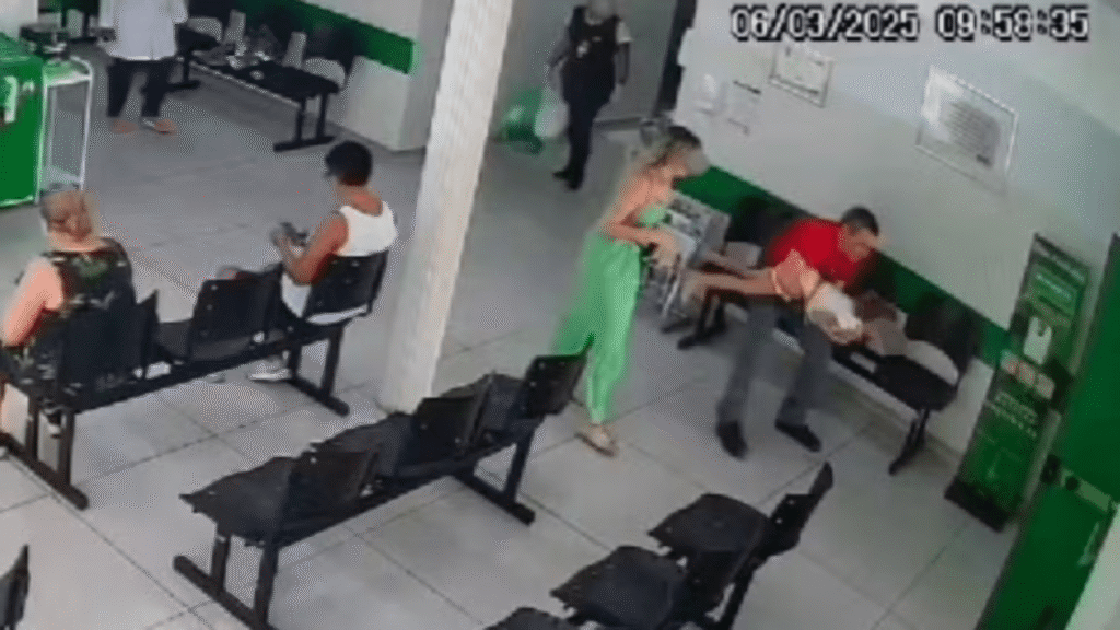 Cabo Thiago Bustamante, que aguardava exames no local, realizou manobras de desobstrução das vias aéreas e evitou tragédia. O salvamento foi registrado por câmeras de segurança.