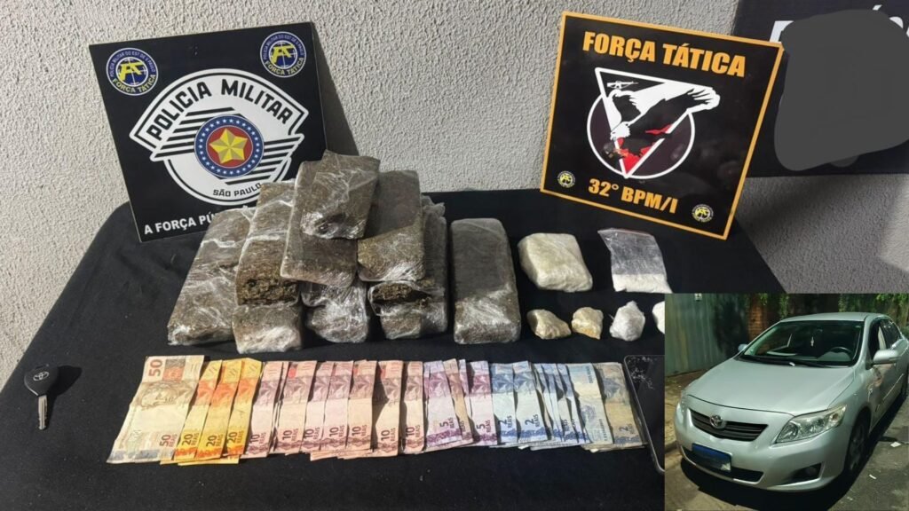 Suspeito abandonou sacolas e tentou fugir para um Corolla prata na noite desta segunda-feira (06). PM apreendeu maconha, crack, cocaína e o veículo na Vila Central.