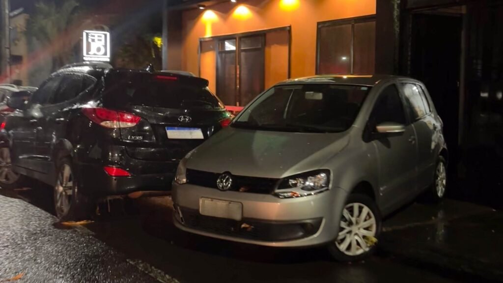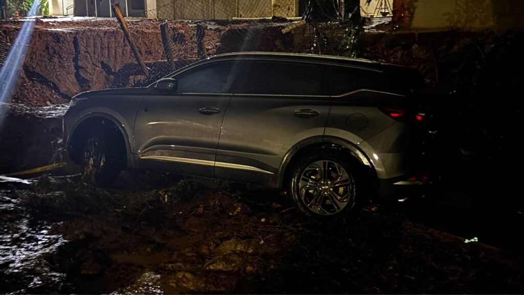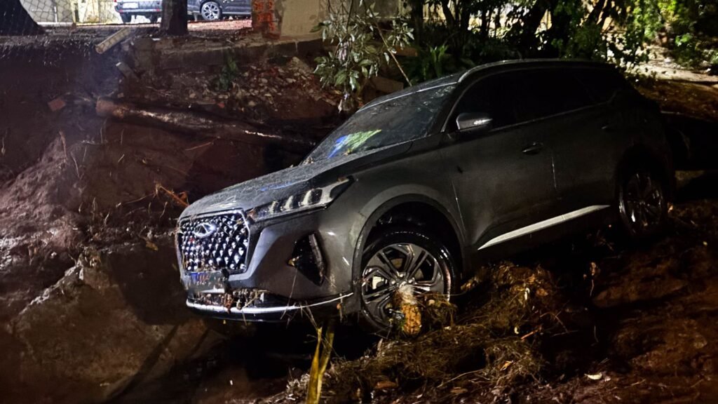 Perto deste ponto crítico, uma das imagens mais impressionantes da noite foi registrada: um carro foi arrastado pela correnteza e acabou parado atrás da Câmara Municipal. Que também teve parte do seu estacionamento destruído pelas chuvas.