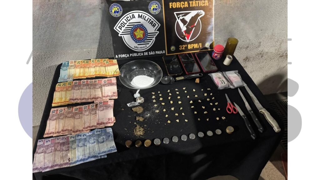Na mesa onde o grupo estava reunido, os policiais encontraram mais porções de crack, um recipiente com cocaína pronta para separação, as três facas utilizadas no corte, uma balança de precisão, embalagens e três aparelhos celulares. Também foi apreendido um total de R$ 1.103,50 em dinheiro.