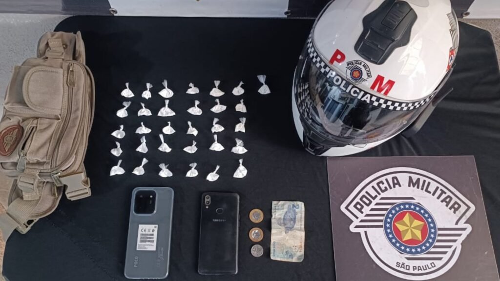 Durante a revista pessoal, a equipe encontrou porções de cocaína nos bolsos do indivíduo. Ao vistoriarem a “bag” que ele havia jogado no chão durante a fuga, os policiais localizaram mais entorpecentes, totalizando 31 porções de cocaína prontas para a venda, além de dois aparelhos celulares (um Xiaomi e um Samsung).