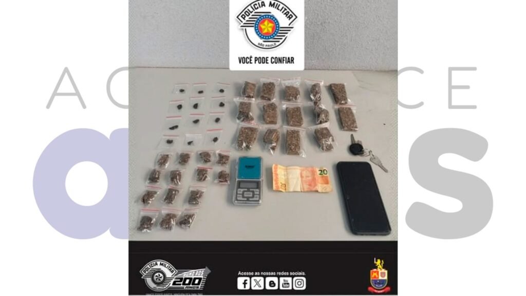 Com apoio de outras viaturas, o homem foi localizado em frente à própria casa. Durante a abordagem, os policiais encontraram uma mochila com 28 porções de maconha, 12 de haxixe, uma balança de precisão, um celular e R$ 20 em dinheiro.