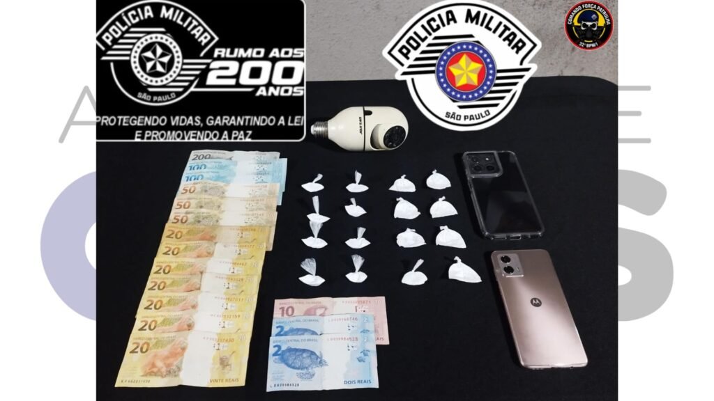 O Flagrante Ao verificarem o pacote arremessado, a equipe constatou que continha 16 porções de cocaína. Além da droga, a revista pessoal no bolso do suspeito foram encontrados dois aparelhos celulares e a quantia de R$ 704,00 em notas diversas, característica típica da venda fracionada de entorpecentes.