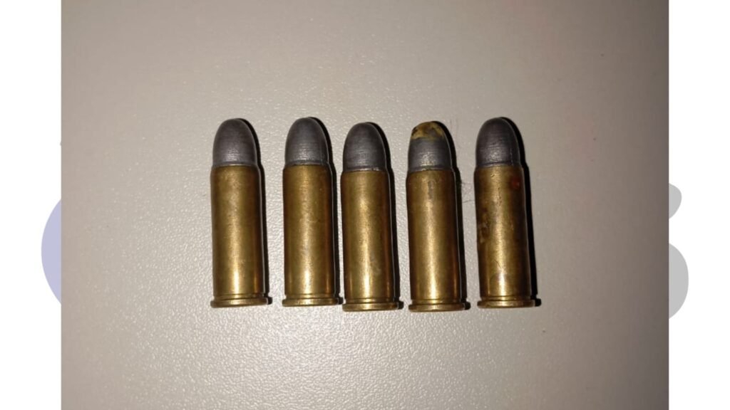 Na vistoria veicular, foi localizada no porta-luvas uma pochete contendo cinco munições intactas de calibre 32.