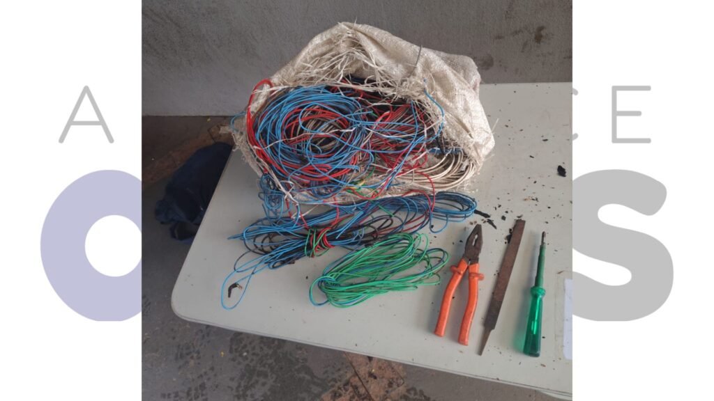 Junto com o suspeito, a equipe apreendeu um alicate, uma lima e uma chave Philips, ferramentas utilizadas para cortar e remover os cabos. O material furtado já estava separado.