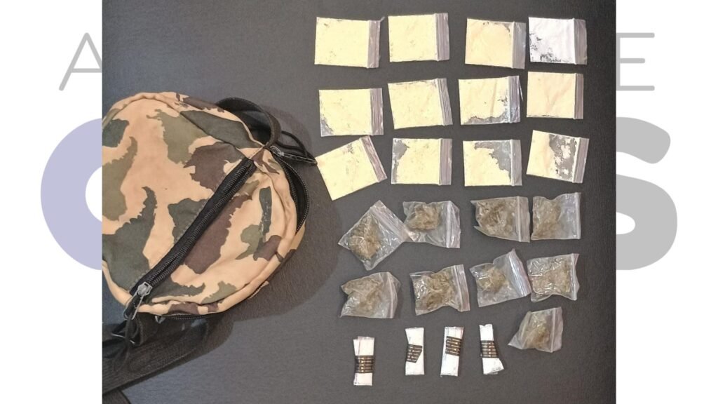 Com ela, os policiais localizaram uma bolsa transversal contendo nove porções de maconha (18g) e 16 porções de cocaína (16g).