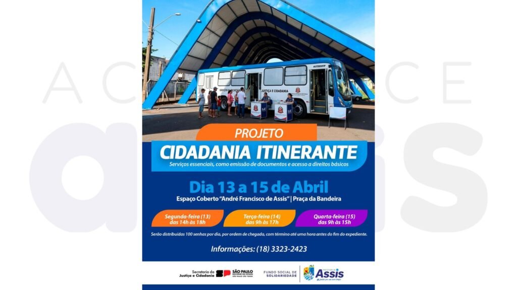 Uma excelente oportunidade para quem precisa regularizar documentos, agendar serviços ou buscar orientações jurídicas sem pagar nada por isso. A Prefeitura de Assis, por meio do Fundo Social, firmou parceria com a Secretaria da Justiça e Cidadania (SJC) do Governo do Estado de São Paulo para trazer à cidade o Projeto Cidadania Itinerante.