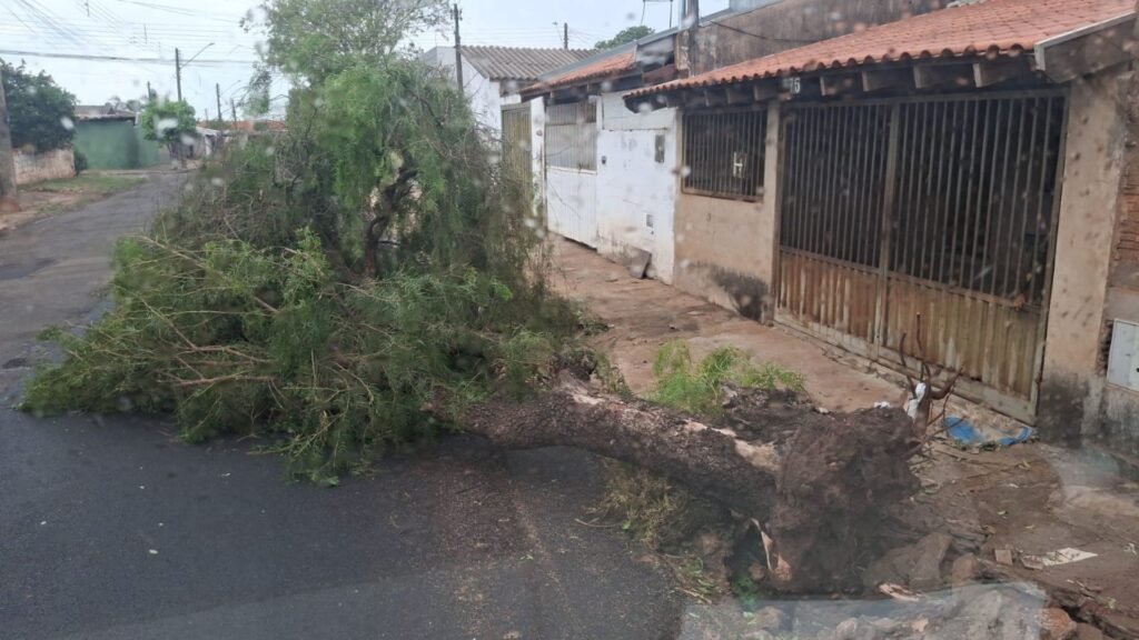 Alerta Laranja do INMET previa granizo, mas ventania trouxe poeira, destelhamentos e quedas de árvores com chuva calma as 14h.