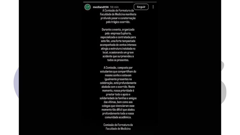 Em nota conjunta, a Comissão de Formatura da Faculdade de Medicina e a empresa Euphoria, contratada para a organização, informaram que “uma forte tempestade acompanhada de ventos intensos atingiu a estrutura instalada no local, ocasionando um grave acidente que surpreendeu a todos”.