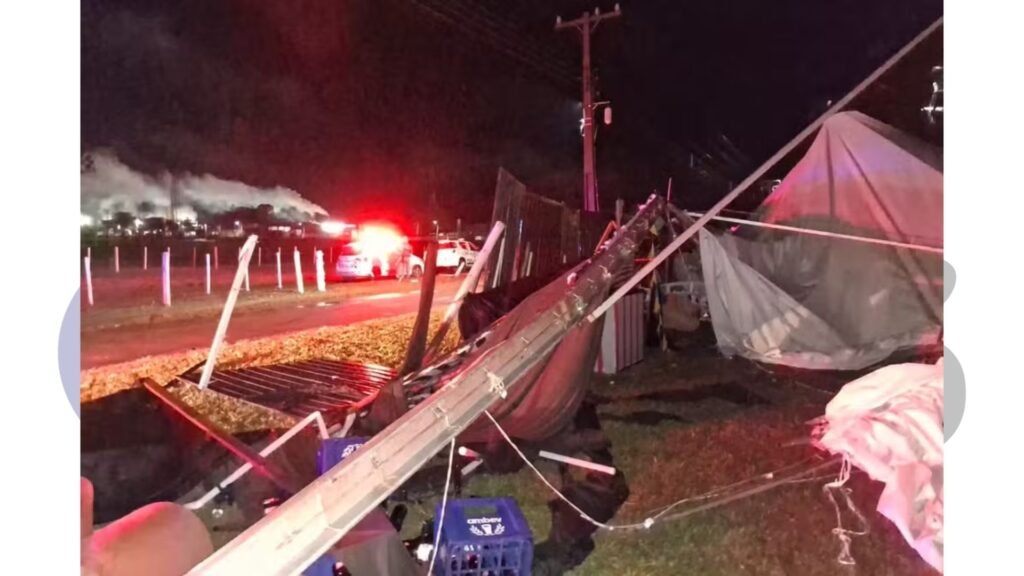 Vítima de 47 anos sofreu traumatismo craniano; ventos de 95 km/h derrubaram hangar onde ocorria evento de formatura.