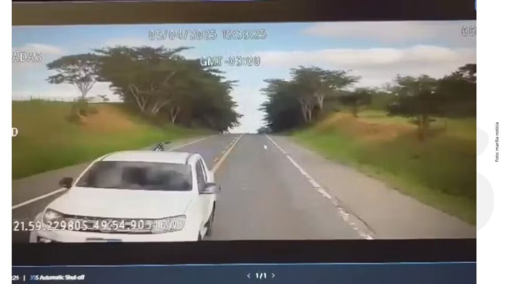 Nas imagens, é possível observar a caminhonete desviando levemente para a pista contrária, culminando no choque frontal com o caminhão.