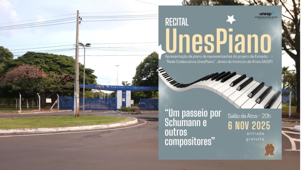 As atividades continuam nesta quinta-feira, 6 de novembro, às 20h, no Salão de Atos, com o Recital de piano “Um passeio por Schumann e outros compositores”. A apresentação será feita por representantes do projeto de extensão “Rede Colaborativa UnesPiano”, do Instituto de Artes da Unesp de São Paulo.